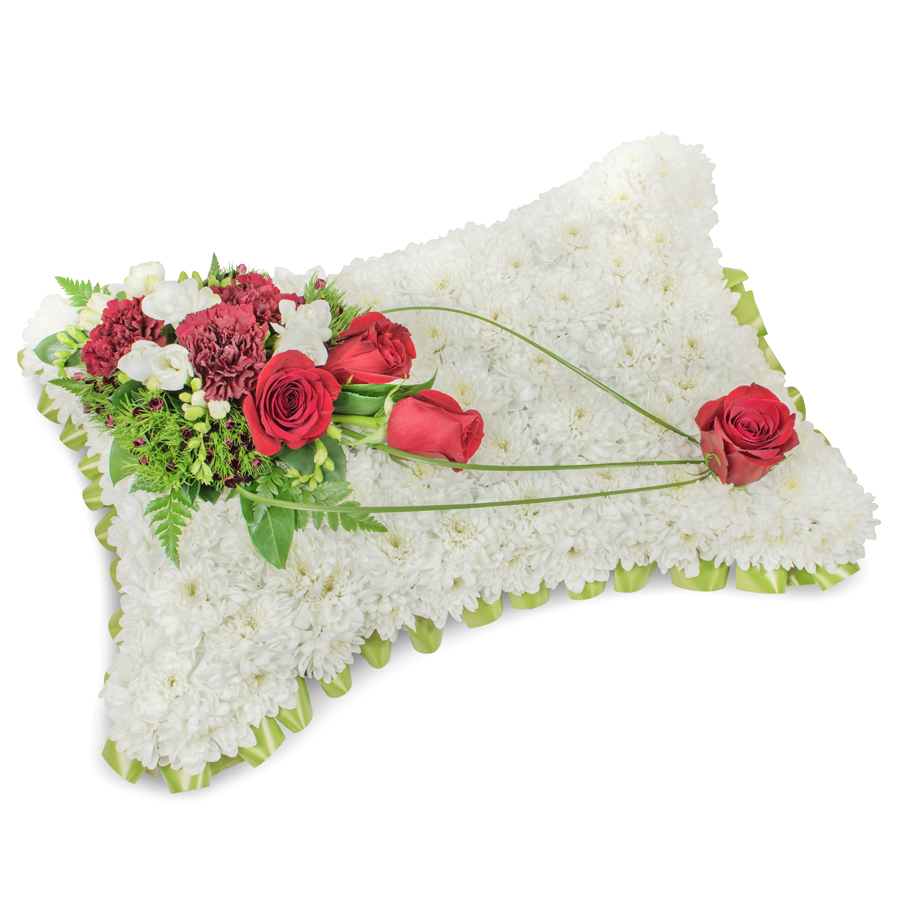 Convey your deepest condolences with our exquisite bouquet featuring elegant white chrysanthemums, passionate red roses, fragrant white freesias, rich dark red carnations, lovely dianthus, and delicate bear grass.