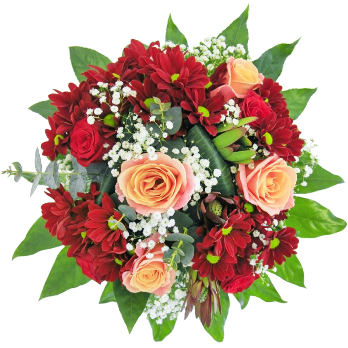 Experience the elegance and uniqueness of our bouquet, featuring sweet peach and scarlet roses combined with deep red spray chrysanthemums and delicate white gypsophila.